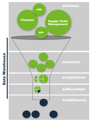 In dem so genannten Data Warehouse werden alle relevanten Daten gesammelt und dem gesamten ETL Prozess (Extraktion-Transformation-Laden) unterzogen. Zur Integration eines Data Warehouses müssen die unterschiedlichen Daten auf eine gemeinsame Struktur zusammengeführt werden.